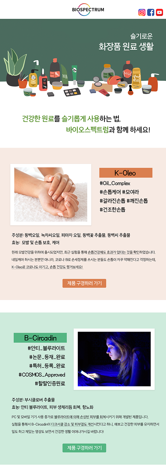 *뉴스레터 최신 자료는 바이오스펙트럼 쇼핑몰 가입시 마케팅 수신동의(이메일)에 체크하시면 빠르게 받아보실 수 있습니다. #바이오스펙트럼원료쇼핑몰 #화장품원료 #원료업체 #기능성원료 #화장품원료회사 #천연화장품원료 #유기농화장품원료#블루라이트차단원료 #화장품고시원료 #부시클로버추출물 #COSMOS #주름