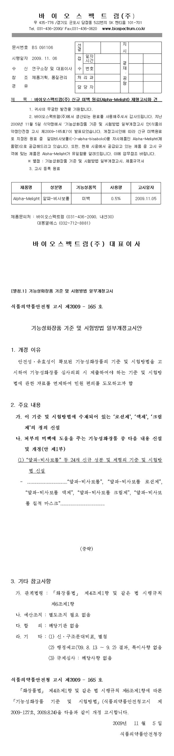 또한, 이번에 신규 미백 원료로서 고시 된 Alpha-Bisabolol 중 식약청으로부터미백 기능성화장품으로 승인 받은 화장품에 사용된 유일한 원료로 고시 되었음을 알려 드립니다. Alpha-bisabolol의 모든 규격은 비고시 미백 화장품을 진행하였던 자사의 Alpha-Melight에 맞추어져 있음을 참고 부탁 드립니다.