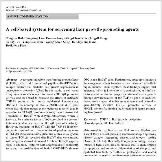 아피제닌은 난소암 자궁경부암 등에 대한 항암효과가 있고 혈압을 낮춰주는 것으로 알려져 있는 물질이다. 이번 논문에서 아피제닌은 모낭(hair follicle)이 퇴행기(catagen)로 접어드는 것을 조절하는 인자 중의 하나인 TGF-β1의 발현을 억제함으로써 dermal papilla cell과 keratinocyte의 성장을 촉진하고 rat vibrissa follicle의 길이를 증가시켜 모간(hair shaft)의 성장을 촉진시킴을 확인하였다. 이로써 아피제닌이 모발의 성장을 촉진하는 물질로 사용될 수 있을 것으로 예상된다고 밝혔다. |