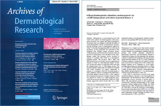 6-Benzylaminopurine의 흑화 효능 논문 발표 공지사항 6-Benzylaminopurine의 흑화 효능 논문 발표 6-Benzylaminopurine(6-BAP)의 흑화 효능 논문 발표 바이오스펙트럼㈜ (대표이사 박덕훈)은 6-benzylaminopurine(6-BAP)이 melanogenesis를 촉진한다는 결과를 국제논문 Archives of…biospectrum2016-08-19