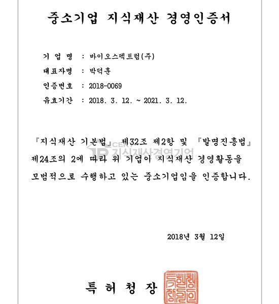바이오스펙트럼 ‘지식재산 경영인증’ 획득 공지사항 바이오스펙트럼 ‘지식재산 경영인증’ 획득 바이오스펙트럼 ‘지식재산 경영인증’ 획득특허청 지원, 기술개발 가점 부여 등 혜택바이오 소재개발 전문기업 바이오스펙트럼(대표 박덕훈)이 지난…biospectrum2018-03-16