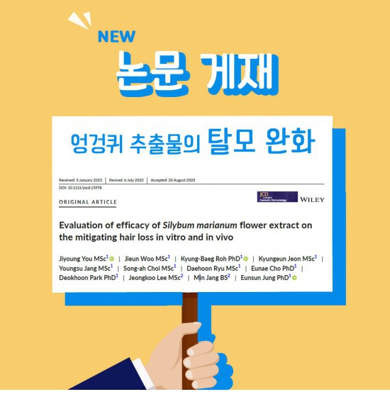 [논문] 엉겅퀴 추출물의 탈모 완화 공지사항 [논문] 엉겅퀴 추출물의 탈모 완화 🎈엉겅퀴 추출물의 탈모 완화 효능에 관한논문이 게재되었습니다🎈Journal of Cosmetic Dermatology 23년 7월호에 게재된이 논문은 '밀크씨슬'로…biospectrum2023-09-20