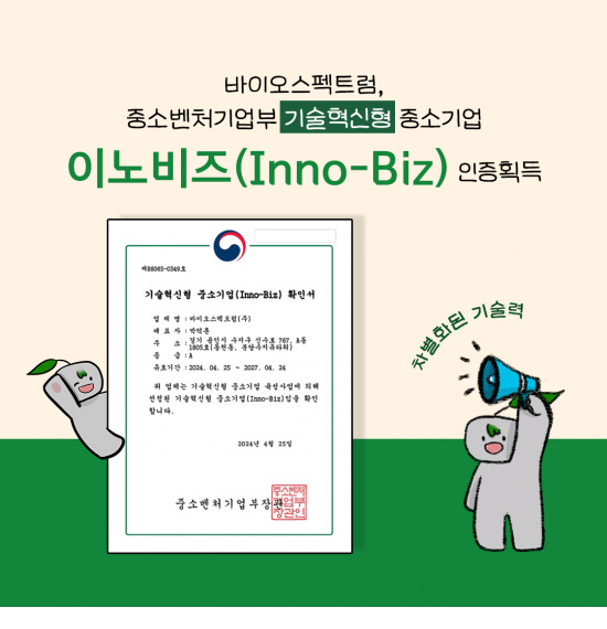 바이오스펙트럼이 중소벤처기업부가 주관하는 기술혁신형 중소기업 인증제도, '이노비즈(Inno-Biz)' 인증을 획득하였습니다~🥳🥳