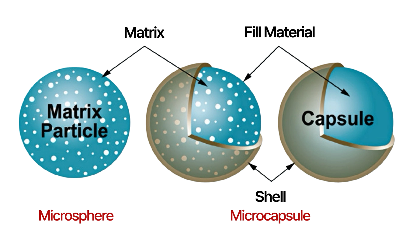 보통 직경이 수 ㎛인 미소한 캡슐을 의미하며 캡슐을 형성하는 재료를 벽물질, 그 속에 봉입되는 물질을 중심물질이라고 합니다. 중심물질로서는 기체ㆍ액체ㆍ고체의 어느 것이라도 쓸 수 있습니다. 중심물질은 캡슐화됨으로써 겉보기 물성이 바뀌어 벽물질에 의해 보호되고 또한 외부로 방출이 제어됩니다. 벽물질로서는 천연 또는 합성고분자가 사용되는 경우가 많이 있습니다. 마이크로캡슐의 제법으로는 계면중합법 등의 화학적 방법, 비용매 첨가나 pH의 제어에 의해 벽물질의 용해도를 변화시켜 석출시키는 코아세르베이션, 가온/감압 등에 의해 벽물질의 용매를 제거하여 피막을 형성하는 계면침전법 등의 물리화학적 방법, 또는 분무건조법 등의 기계적 방법이 있습니다.
